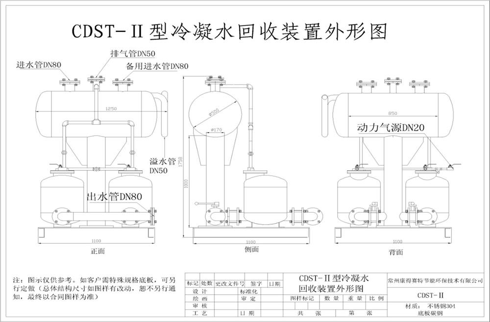 CDST-Ⅱ型冷凝水氣動回收組合泵裝置(除底板)均為不銹鋼304制作,包括內(nèi)部機構,堅固防蝕。